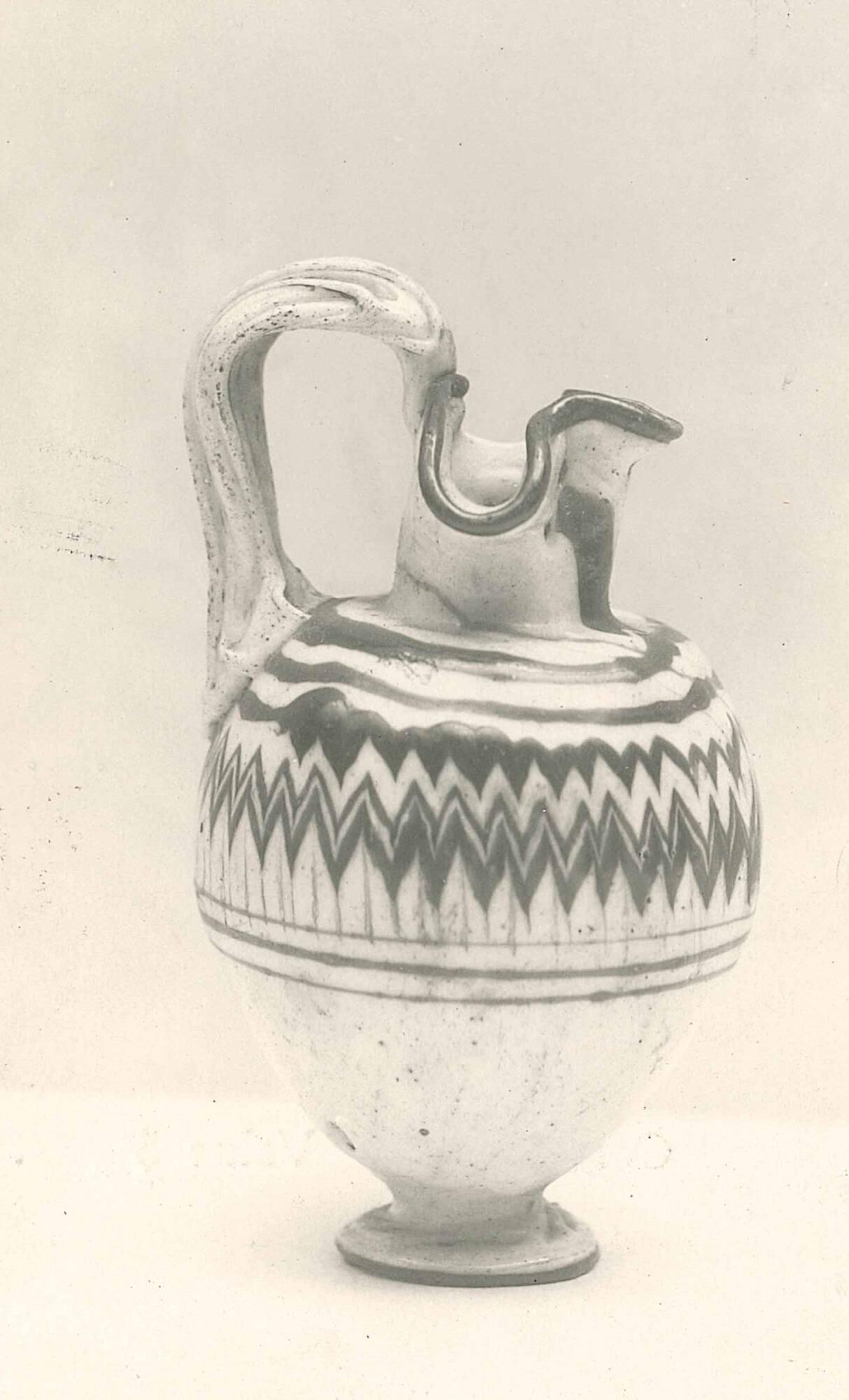 DescriptionThis core-formed oinochoe features an opaque white ground with purple decoration. It has a broad trefoil rim-disk, a short cylindrical neck, a sharply angled shoulder, and an ovoid body that rests on a short, outsplayed foot with a small central depression. A single strap handle in opaque white glass arches from the shoulder to the rim.