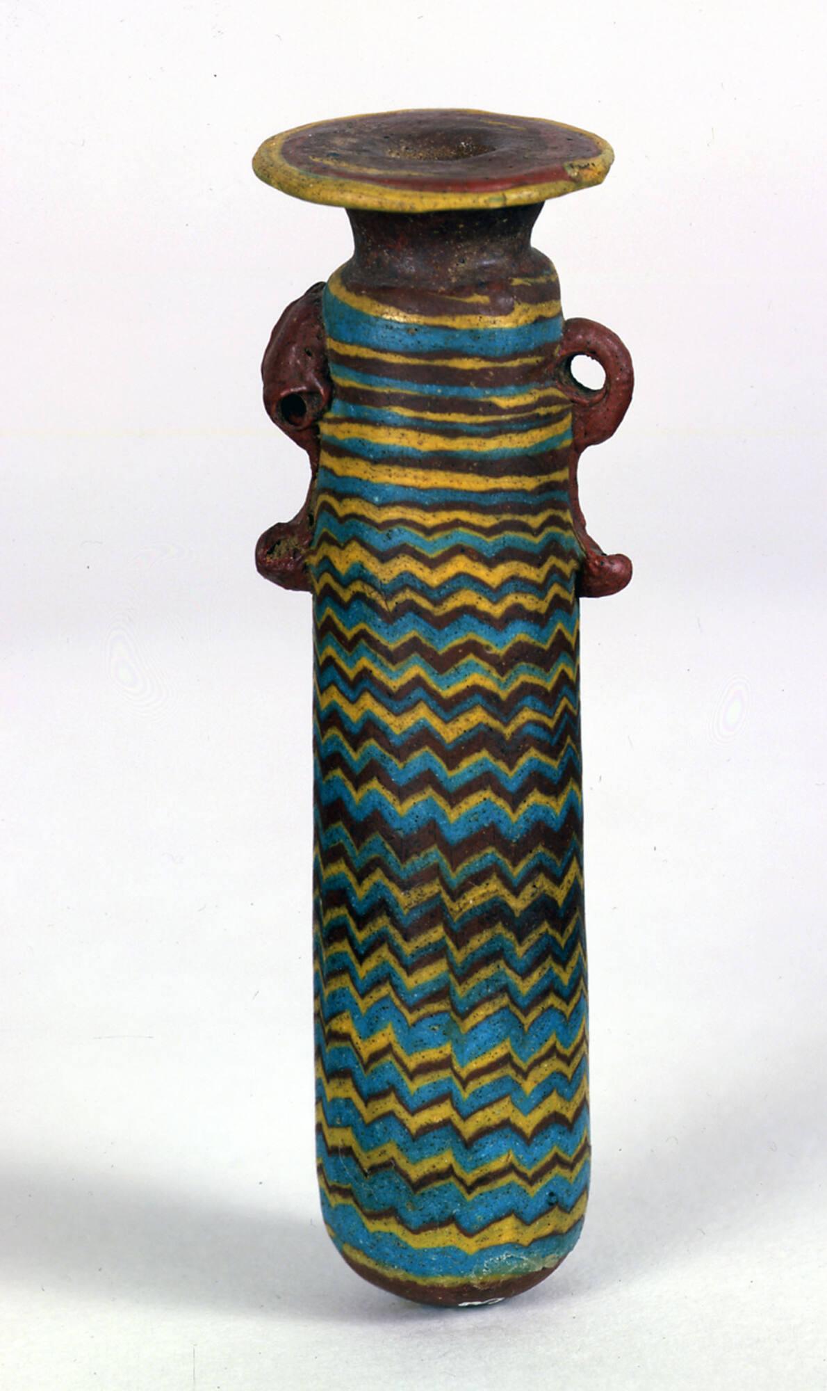 DescriptionThis alabastron is made from opaque red-brown glass with applied decoration in opaque yellow and opaque turquoise-blue. The vessel has a broad horizontal rim-disk, a cylindrical neck that tapers slightly upward, and a pronounced rounded shoulder. The cylindrical body tapers slightly toward a convex bottom. Two unusually large vertical ring handles of red-brown glass, with knobbed tails, are applied below the shoulder at differing heights.