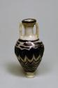 DescriptionThis small jar, or amphoriskos, has an opaque white ground with decoration in purple glass. It features a broad, inward-sloping rim-disk and a rather tall cylindrical neck that tapers slightly upward, joining an obtuse-angled shoulder. The tall, conical body rests on a circular base-knob with a rounded edge, made of the same opaque white glass as the vessel.