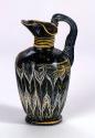 DescriptionThis oinochoe has a cobalt-blue ground that appears black, with opaque yellow and opaque white decoration. It features a broad trefoil rim-disk, a cylindrical neck, and a near right-angled transition to a rounded shoulder. The straight-sided cylindrical body tapers downward and terminates in a low, circular pad-base that is asymmetrical, uneven, and slightly concave underneath. A cobalt-blue strap handle arches from the shoulder to the edge of the rim-disk. An unmarvered opaque yellow thread is attached at the rim’s edge. A second unmarvered opaque yellow thread begins at the top of the neck and is wound spirally in horizontal lines to near the bottom of the neck. On the shoulder, a marvered opaque yellow thread is wound spirally in two horizontal lines and then tooled into a feather pattern extending to the base; mingling with it in alternating bands is a marvered opaque white thread. A final unmarvered opaque yellow thread is wound around the edge of the pad-base. The vessel is core-formed, with applied rim-disk, handle, and pad-base, and applied marvered and unmarvered threads.