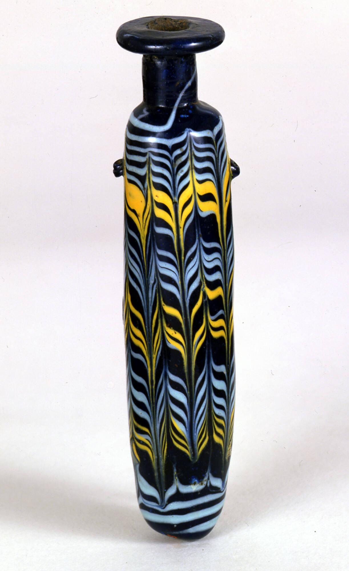 DescriptionAlabastron with a cobalt-blue ground and decoration in opaque white (appearing pale blue) and opaque yellow. The vessel features a thick, moderately broad horizontal rim-disk with a rounded edge, a cylindrical neck, and a pronounced, nearly right-angled shoulder. The straight-sided cylindrical body tapers inward near the base and terminates in a convex bottom, flat on one side. Two small cobalt-blue lugs are positioned below the shoulder, each bearing a shallow depression facing upward.