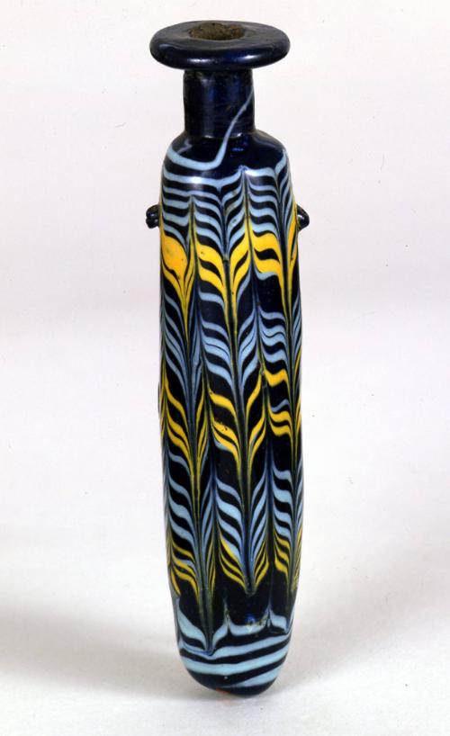 DescriptionAlabastron with a cobalt-blue ground and decoration in opaque white (appearing pale blue) and opaque yellow. The vessel features a thick, moderately broad horizontal rim-disk with a rounded edge, a cylindrical neck, and a pronounced, nearly right-angled shoulder. The straight-sided cylindrical body tapers inward near the base and terminates in a convex bottom, flat on one side. Two small cobalt-blue lugs are positioned below the shoulder, each bearing a shallow depression facing upward. An opaque white thread, marvered, is attached at the rim and trails diagonally across the neck to the shoulder, where it is wound once around the body. From there, it is tooled into a feather pattern extending down to the lower body, finishing with two horizontal windings near the base. A marvered opaque yellow thread begins at the level of the lugs and is interwoven with the white in alternating bands that continue to the basal angle. Manufactured using the core-forming technique, the vessel also includes an applied rim-disk and lugs, as well as applied marvered threads.
