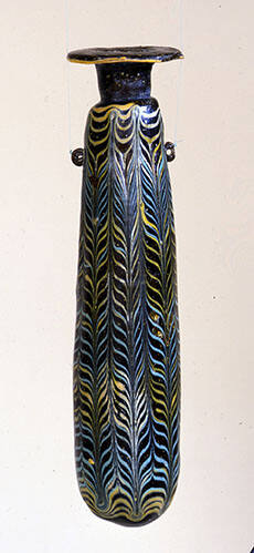 DescriptionThis is a tall, cylindrical vessel known as an alabastron. It has a wide, flat rim-disk, a short cylindrical neck, and a convex bottom. The body is made of translucent, golden-brown glass. Two small, vertical ring handles made of the same brown glass are applied to the vessel's shoulder area. The entire body is decorated with a dragged feather pattern created by fine, wavy lines of opaque yellow and opaque pale blue glass, which are arranged in seven distinct vertical panels. An unmarvered (raised) thread of opaque yellow glass is applied at the edge of the rim. The vessel was manufactured using the core-forming technique