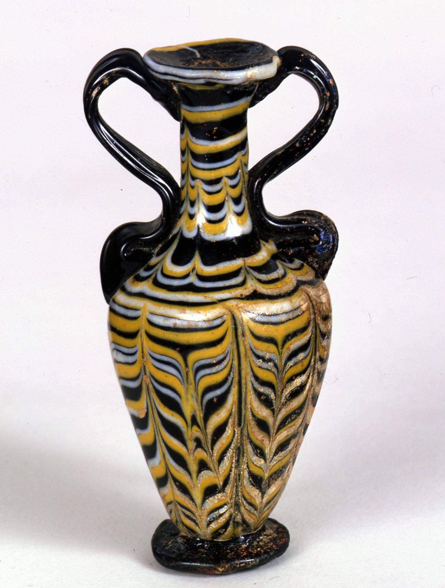 Two vertical s-shaped handles of dark yellow-green glass extend from the shoulder to the underside of the rim-disk. These are joined to the shoulder and lower neck, rising to just above the rim-disk. Marvered opaque white and yellow threads are applied at the edge of the rim-disk and wound spirally in nearly horizontal lines around the upper neck. The threads are then tooled into a festoon pattern across the neck and shoulder, and into a feather pattern that continues over the body to the base. The vessel is core-formed, with trailed and applied decoration, including applied handles and base.