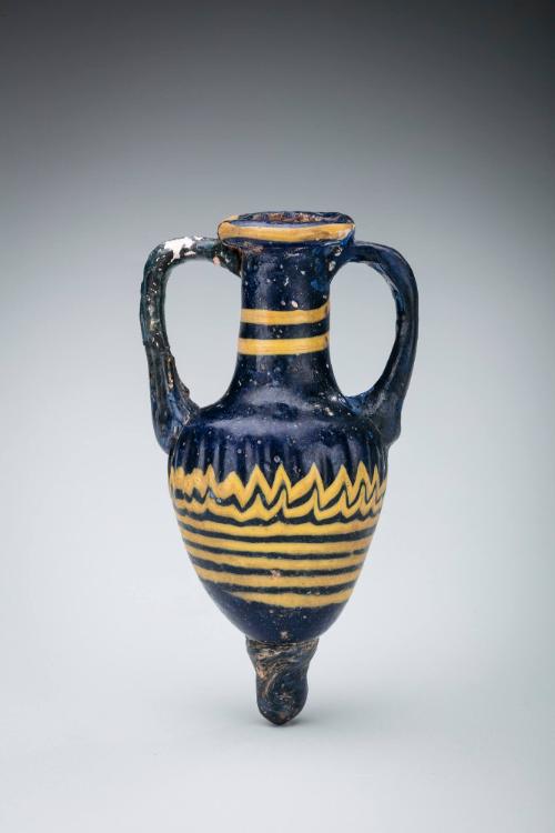 DescriptionThis small core-formed amphoriskos has a dark blue ground (appearing black) decorated with a single opaque yellow thread. The vessel features a narrow horizontal rim-disk with a rounded edge, a tall cylindrical neck with a slight upward taper, and an ovoid body that ends in a convex, pointed bottom. A fairly long, dark blue twisted base-knob extends from the base. Two vertical blue strap handles join the shoulder to just below the rim-disk. A marvered opaque yellow thread is applied at the rim and wound in two horizontal lines around the neck, then tooled into a close-set zigzag pattern below the shoulder. The thread continues in nearly horizontal spirals around the lower body. Tooling marks from the zigzag pattern create short, pronounced vertical indentations on the shoulder.