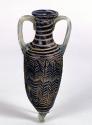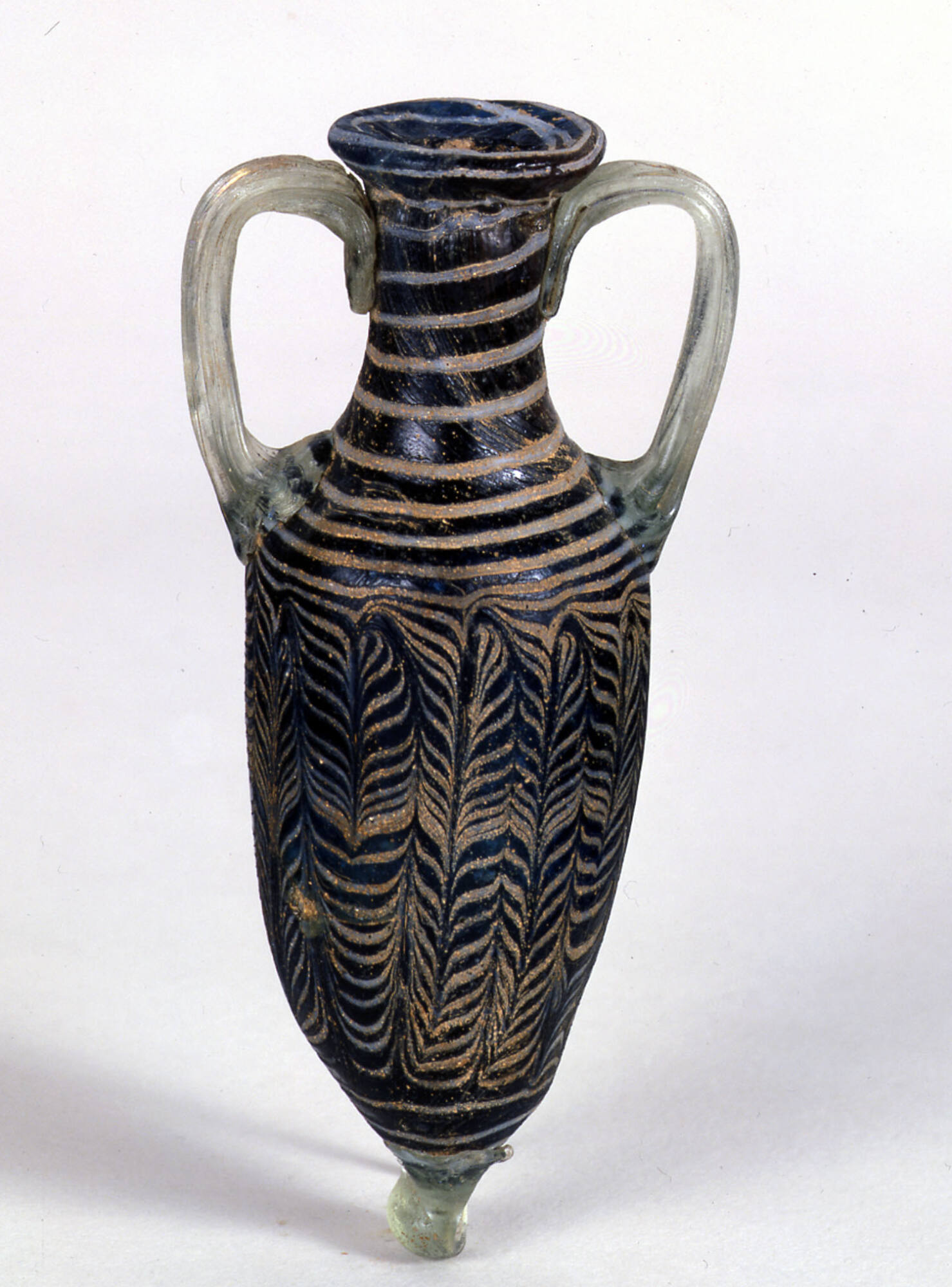 Manufactured using the core-forming technique, the amphoriskos also includes applied rim-disk, handles, base-knob, and applied marvered threads.