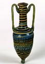 DescriptionThis amphoriskos is made of core-formed glass with a dark yellowish-green ground (appearing opaque black), with opaque yellow and opaque turquoise-blue decoration. It has a moderately broad, uneven, inward-sloping rim-disk; a very tall cylindrical neck; wide obtuse-angled shoulder; and an ovoid body with a convex pointed bottom. A short, bulbous base-knob in natural yellowish-green glass finishes the vessel. Two strap handles of the same natural glass extend from the shoulder to just above the rim-disk. A marvered opaque yellow thread is applied at the rim-disk edge and wound spirally in almost horizontal lines around the neck and over the shoulder, then tooled into a close-set festoon pattern on the body, and again wound horizontally to the base-knob. A marvered opaque turquoise-blue thread, added on the neck, mingles with the yellow and ends in a horizontal line above the base-knob.