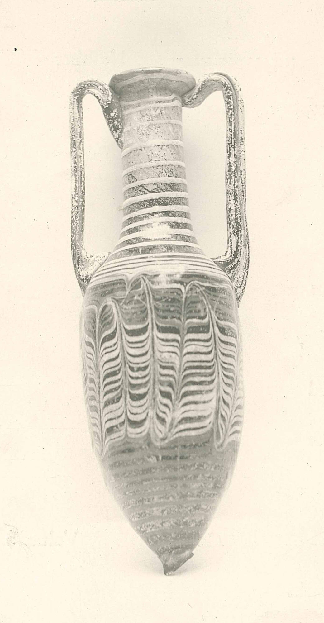 An opaque yellow thread, marvered into the surface, is attached at the edge of the rim-disk and wound spirally. It first forms almost horizontal lines around the neck and shoulder, then is tooled into a close-set festoon pattern on the body, and finally continues in horizontal lines down to the base-knob. A marvered opaque turquoise-blue thread is also applied at the neck. This thread mingles with the yellow and concludes in a single horizontal line just above the base-knob. The vessel is core-formed, with applied rim-disk, handles, and base-knob, as well as applied marvered threads.