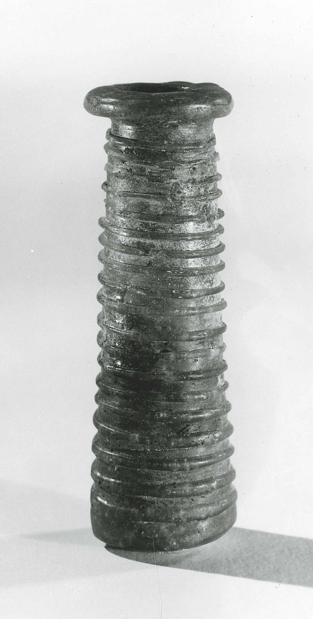 DescriptionKohl tube. Natural bluish-green. Restored with a moderately broad horizontal rim with rounded edge; no shoulder; elongated cylindrical body, tapering upward; flat, uneven bottom. The inside of the tube is cylindrical and extends to the bottom. An unmarvered bluish-green thread is begun on the uppermost part of the body and wound spirally in almost horizontal lines to the bottom.