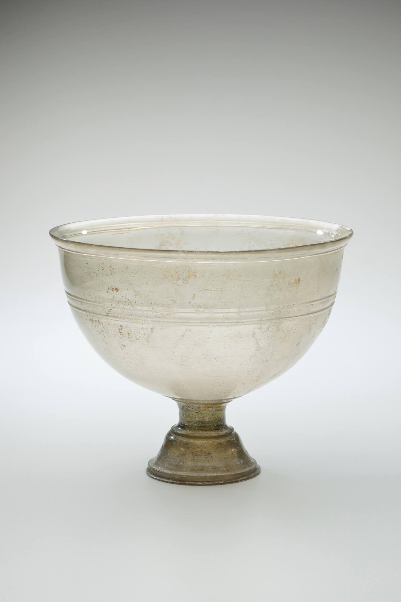 Label TextOne of the treasures of TMA’s ancient glass collection, this krater is unparalleled because of its early date, large size, and elegant form. It appears to be one of the earliest examples of magnificent Hellenistic Greek tablewares, which were produced before the invention of glass blowing. It was cast in a mold from a large “blank” of glass, then lathe-cut and polished to make an astoundingly thin vessel wall. The concept of complete tableware services in glass for serving and consuming food and drink was new and glassmakers rose to supply the market with luxurious objects.Published ReferencesHarden, Donald B., "A Hellenistic Footed Glass Bowl of Alexandrine Origin", in Toledo Museum of Art Museum News, vol. 22, 1980, pp. 17-25.