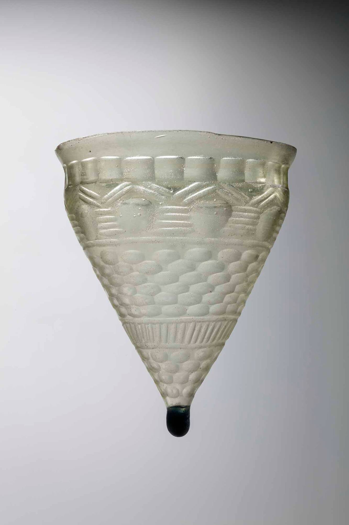 DescriptionA conical glass vessel with a slightly flared, unworked rim and a pointed base terminated by an applied drop of dark cobalt blue glass. The body is blown from colorless glass with a natural greenish tint. The exterior surface is extensively wheel-cut in a complex architectural design, removing much of the original surface. The decoration is organized in horizontal registers: a band of square facets below the rim; a main frieze of arcade arches supported by piers, created with narrow wheel cuts; oval facets; and a lower band of vertical cuts. The distinct inward turn of the profile just below the lip creates a slight shoulder.
