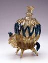 DescriptionBrownish colorless and vivid turquoise-blue glass; flask blown and tooled; cage and animal features applied and tooled on the pontil