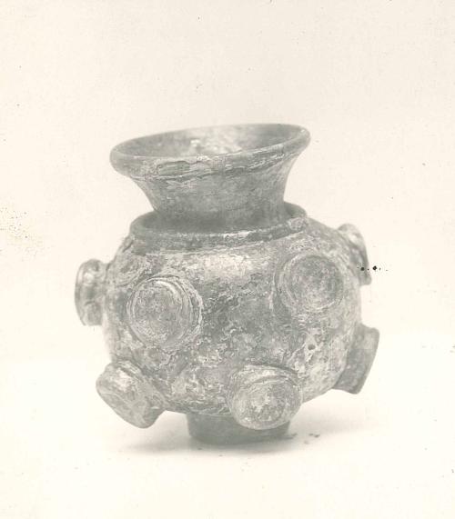 DescriptionDark purple body; applied yellow decoration; flared rim; applied thread on shoulder; spherical body; body decoration with ten applied disks; similar, larger disk forms base.