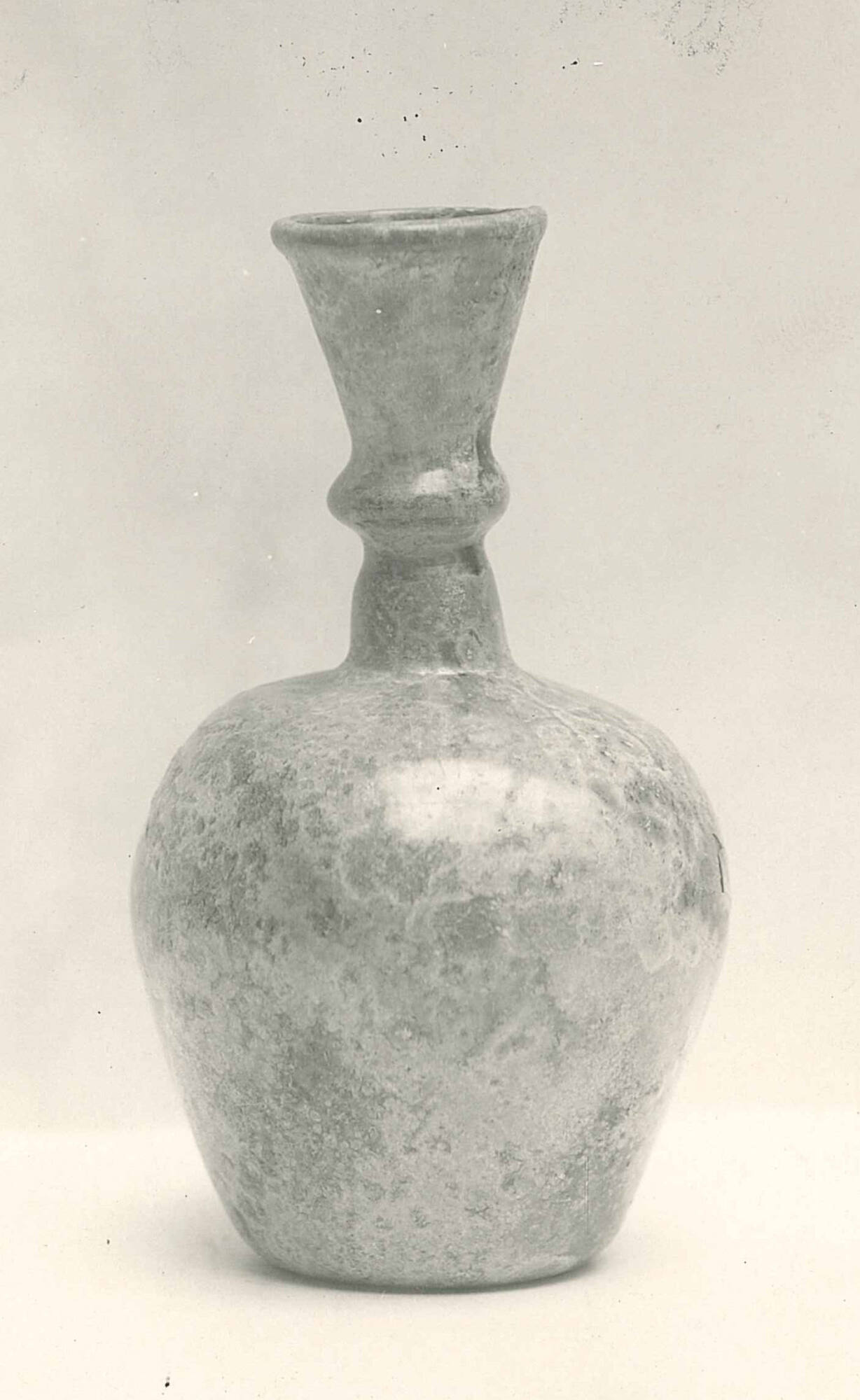 DescriptionNatural light green; upper half of neck conical, tooled flange in center of neck; bottom half of neck bulges slightly; inverted ovoid body.