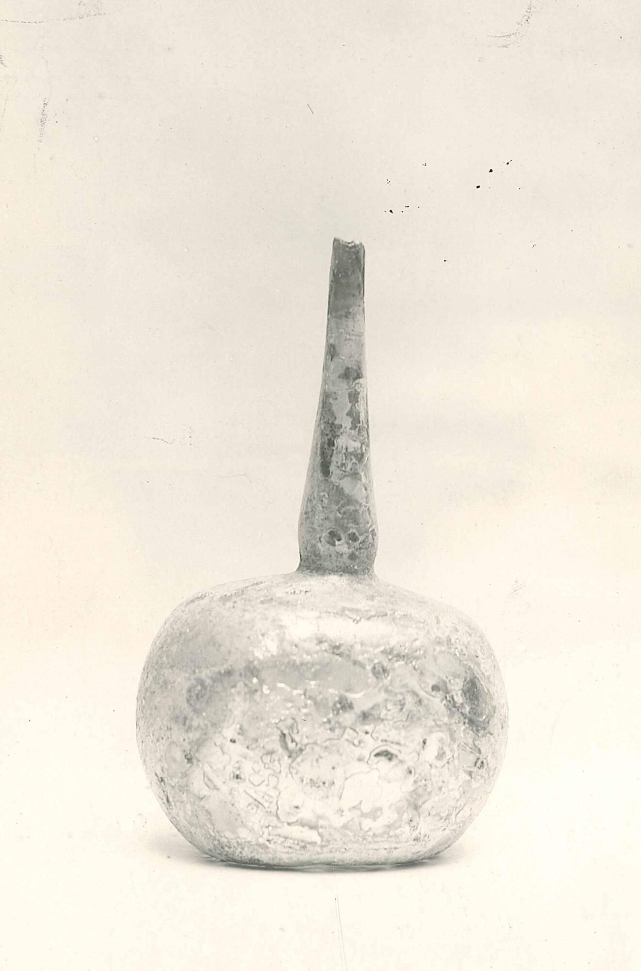 DescriptionColorless; small mouth; neck widens near shoulder, constricted at shoulder; flattened spherical body; angular shoulder.