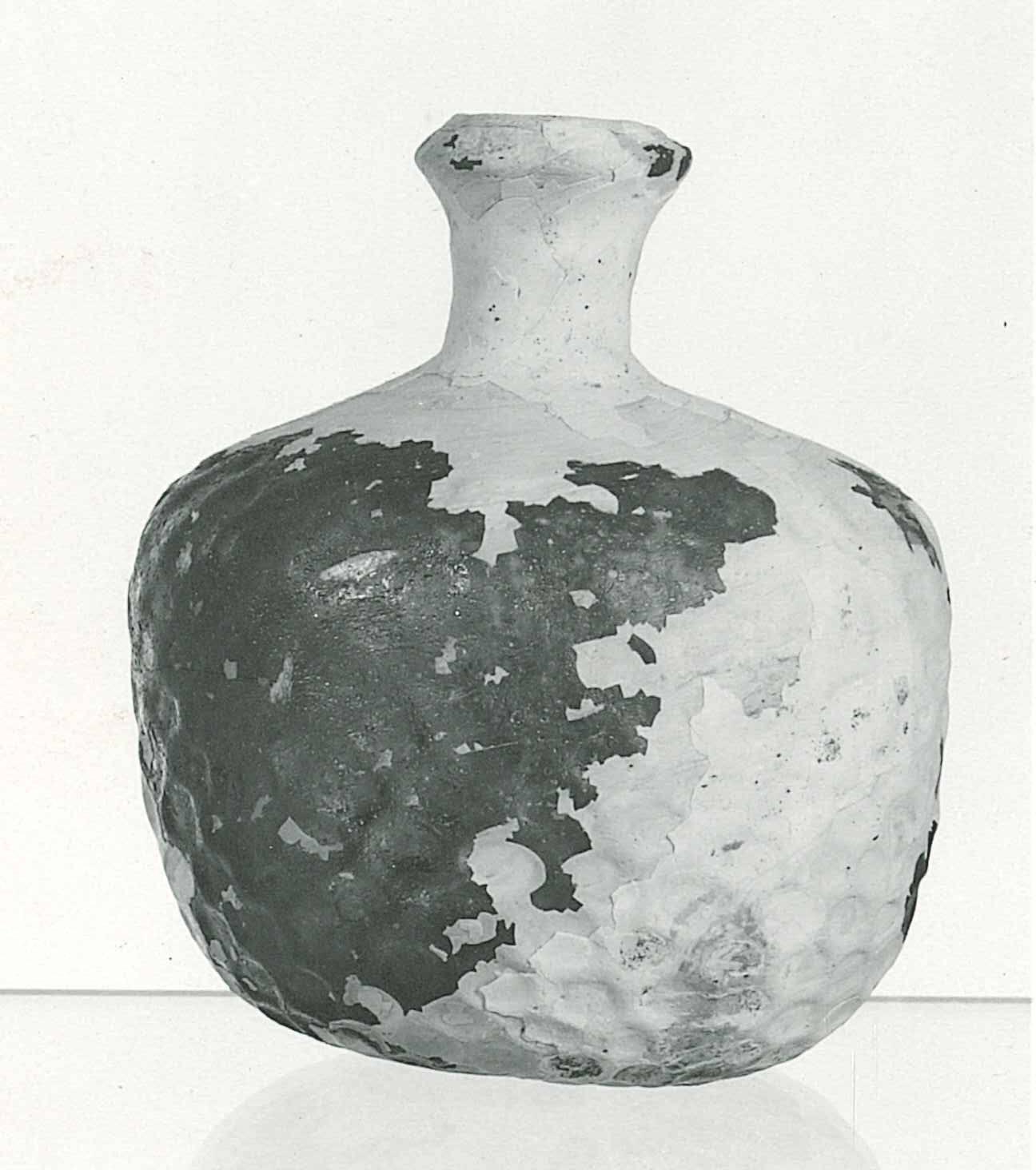 DescriptionA small bottle of green glass featuring a globular body and a short, narrow neck. The body is decorated with a "honeycomb" or faceted pattern, created by blowing the glass into a textured mold. The surface exhibits white incrustation and partial weathering.
