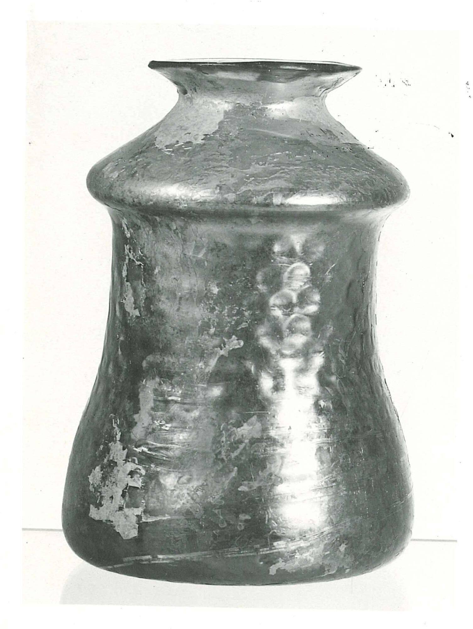 DescriptionA small jar or vase of transparent golden-amber glass. The vessel features a flared rim, a constricted neck, and a globular body that tapers slightly towards the base. The body is decorated with a faint "honeycomb" pattern of concave circles, created by blowing the parison into a patterned mold before expansion. The surface exhibits light iridescence and pitting consistent with archaeological burial.
