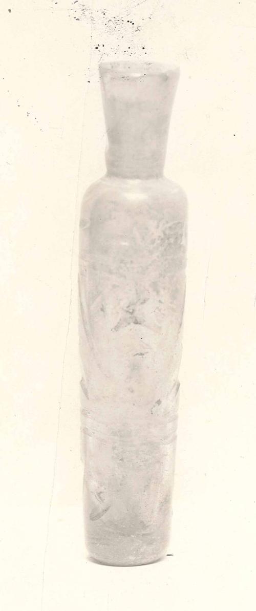 DescriptionColorless; conical neck; three shallow cuts in neck; straight-sided body, narrowing slightly toward base; body decoration in three sections, separated by two horizontal rings; row of crescents alternating with ovals; U-shaped cuts enclosing crescents and ovals; triangles alternating with ovals.