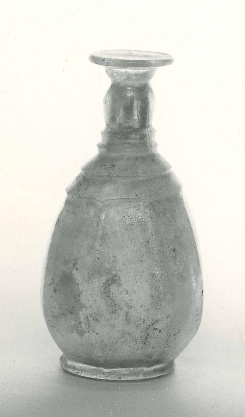 DescriptionColorless; horizontal rim; angular protrusion on neck below rim; slightly bulging neck; lower neck with two protruding rings; ovoid body; two-tiered shoulder; body cut into eight sides; eight-sided base.