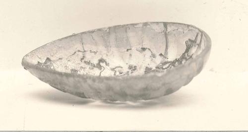 DescriptionColorless; hollowed-out ovoid shape; on exterior two double concentric circles; one double half circle; each side with three leaf-like motifs.