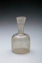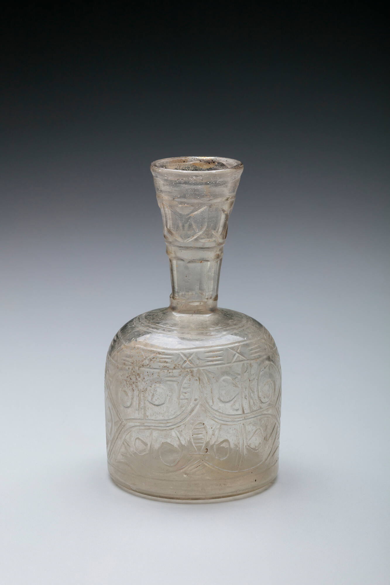 Label TextThis bottle is a superb example of the "beveled" or "slant-cut" style, a technique that revolutionized Islamic glass and stucco carving in the 9th century. Instead of cutting down to a flat background, the glass cutter ground the surface at angles to create smooth, curved ridges that catch the light. The abstract design—a mesmerizing mix of scrolling vines and geometric shapes—reflects the artistic tastes of the Abbasid caliphates in Samarra (Iraq) and Nishapur (Iran). Small, sturdy bottles like this were likely used to hold expensive perfumes or oils, their thick walls protecting the precious contents inside.Published ReferencesRiefstahl, Rudolf M., "Ancient and Near Eastern Glass," Toledo Museum News, New Series, Vol. 4, No. 2, Spring 1961, p. 42.