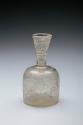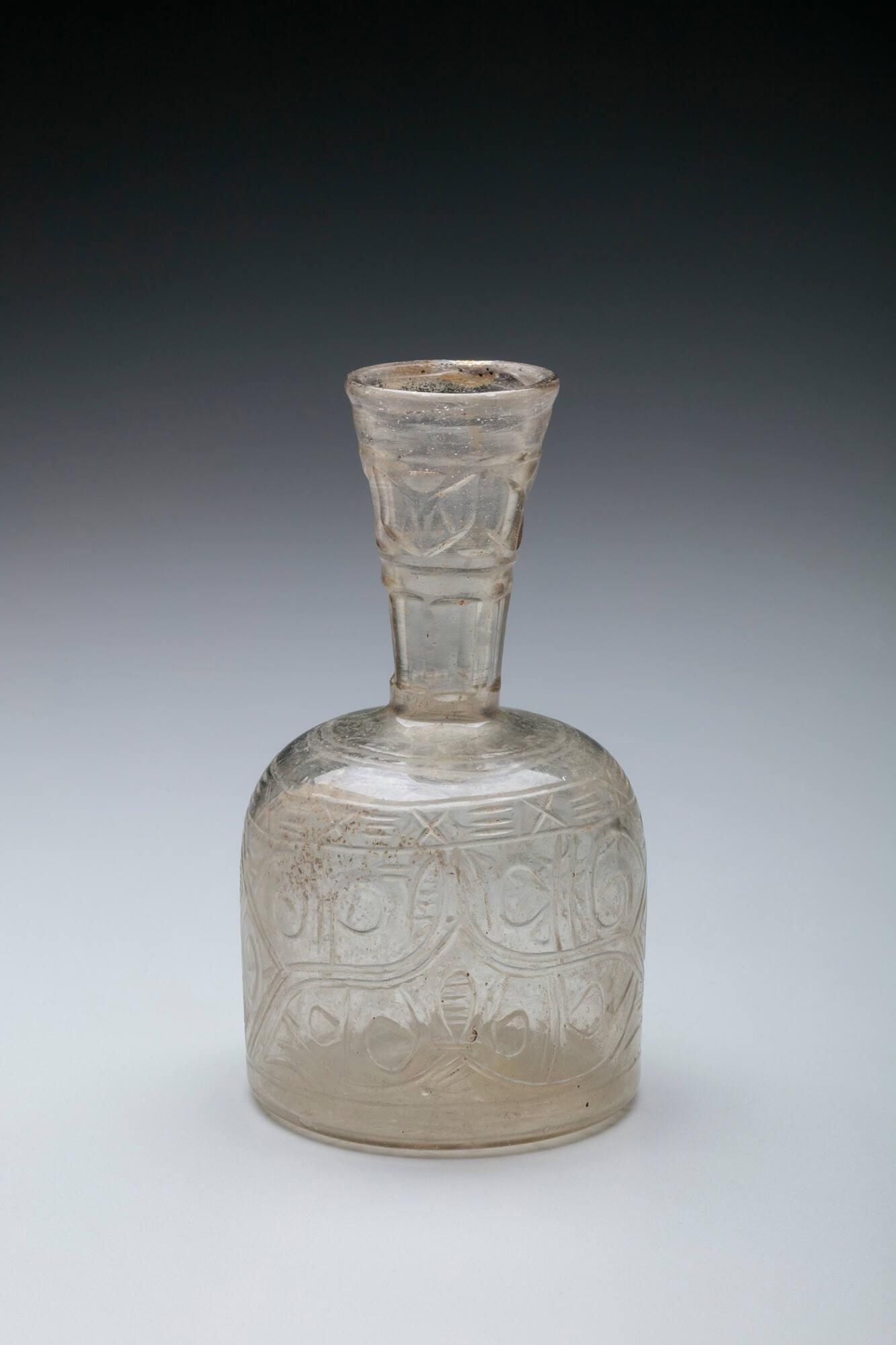 DescriptionA small, colorless glass bottle featuring a cylindrical body with a flat base, a sloping shoulder, and a tall, flaring neck. The thick walls are deeply carved in the beveled style (slant-cut) with abstract, stylized vegetal and geometric motifs. The body decoration consists of rhythmic, curvilinear scrolls and palmettes set within geometric lozenges or cartouches, created by wheel-cutting the glass at an angle to form ridges without a flat background plane. The neck features faceted or horizontal cut bands.