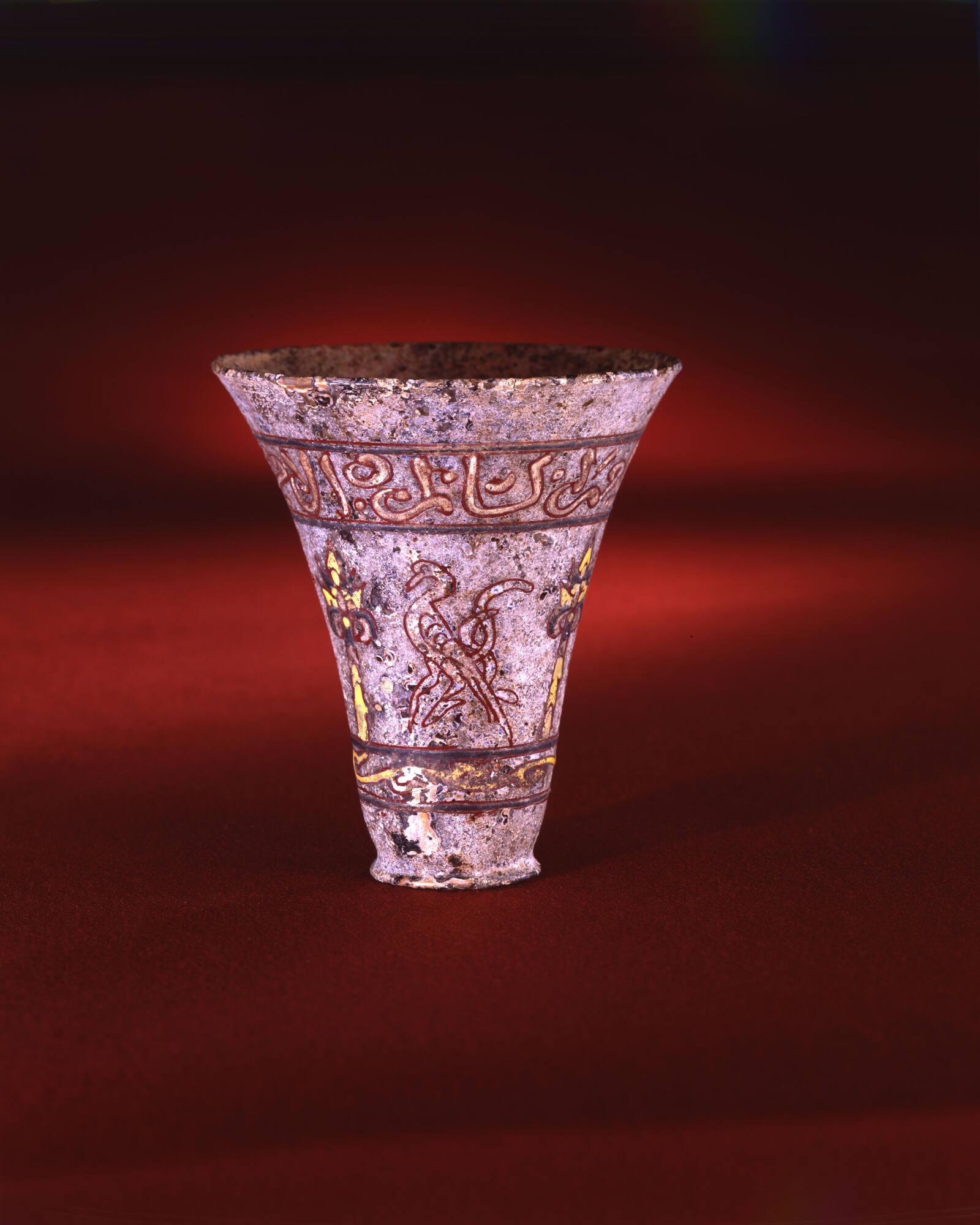 DescriptionA colorless, bubble-blown glass beaker featuring a flaring rim and a slightly bulbous body that tapers to a foot. The surface exhibits pitting and iridescence consistent with archaeological glass. The decoration is executed in polychrome enamels (red, white, yellow, black) and gold. The decorative scheme is divided into zones: an upper band containing a calligraphic inscription, a central field featuring two birds flanking a stylized palm leaf or vegetal motif, and a lower band of scrolling tendrils.