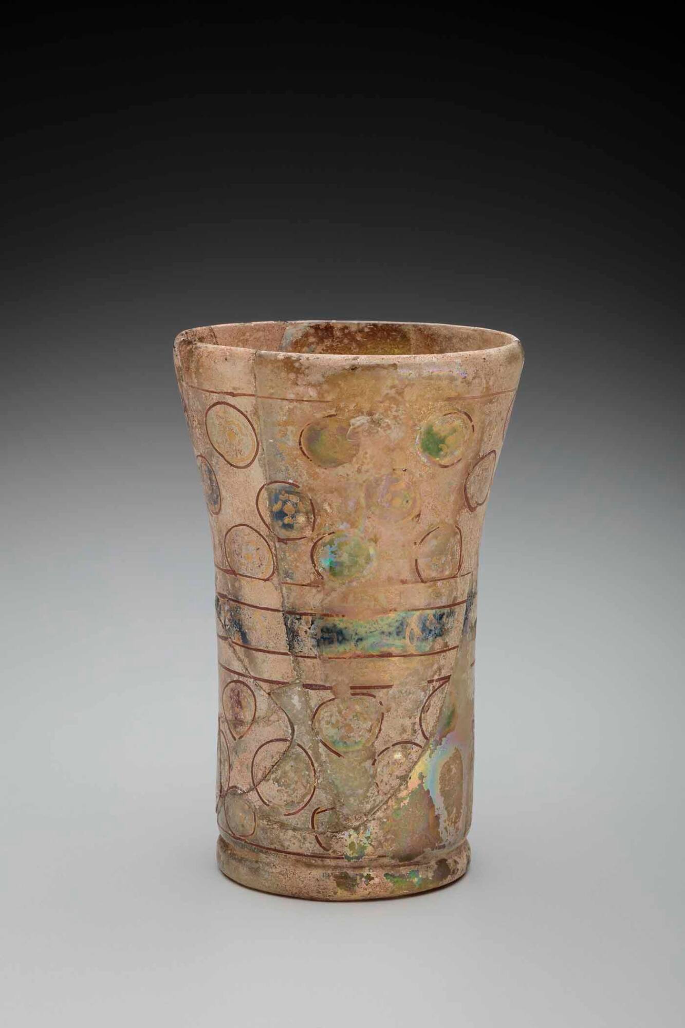 DescriptionColorless; red, green, and blue enamels; gilded; flared rim; cylindrical body; applied flattened base ring; decorated with circles in alternating colors.