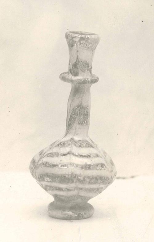 DescriptionPurple body; applied opaque white decoration; upper neck conical; lower neck cylindrical; two sections separated by tooled flange; flattened conical body; circular foot; decorated with applied and marvered opaque white threads in looped pattern.