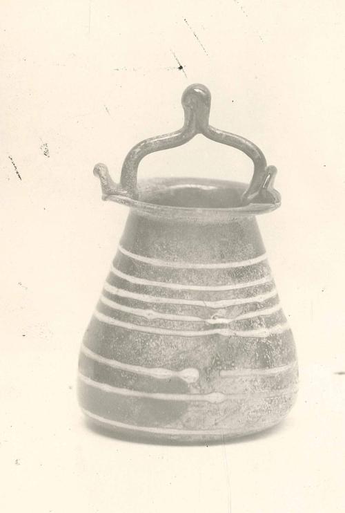 DescriptionPurple ground and handle; applied white decoration; flared rim; basket handle, pinched together at top; body widens toward base; decorated with white spiral thread.