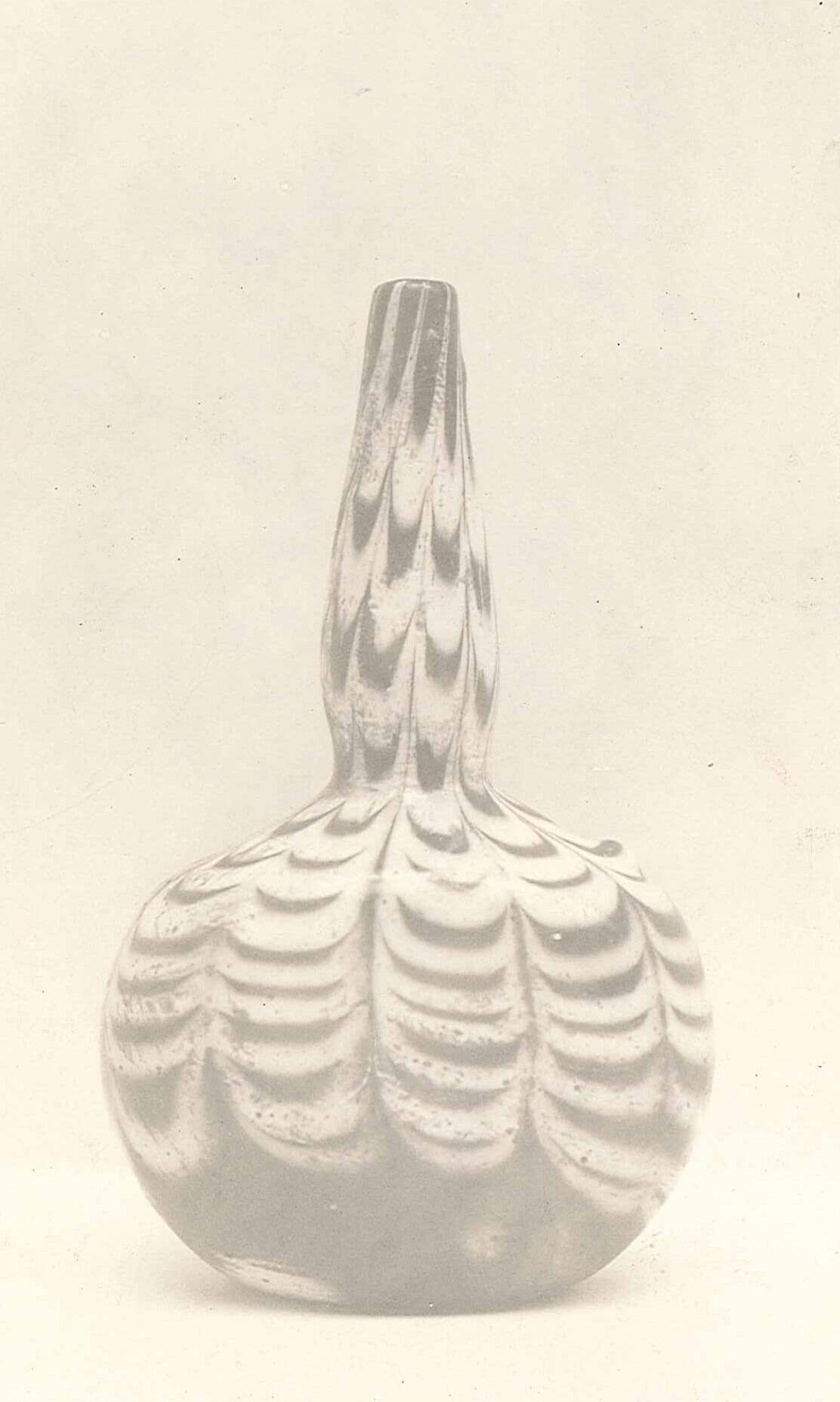 DescriptionDark purple body; applied opaque white decoration; small mouth; neck bulges slightly, then is constricted at juncture with body; flattened spherical body; decorated with opaque white trails and marvered threads in looped pattern.