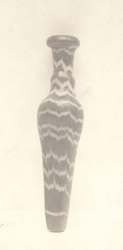 DescriptionPurple ground; applied opaque white decoration; offset rim, bulge in neck near juncture with body; four-sided body, narrows toward bottom; decorated with opaque white trailed and marvered in uneven pattern.