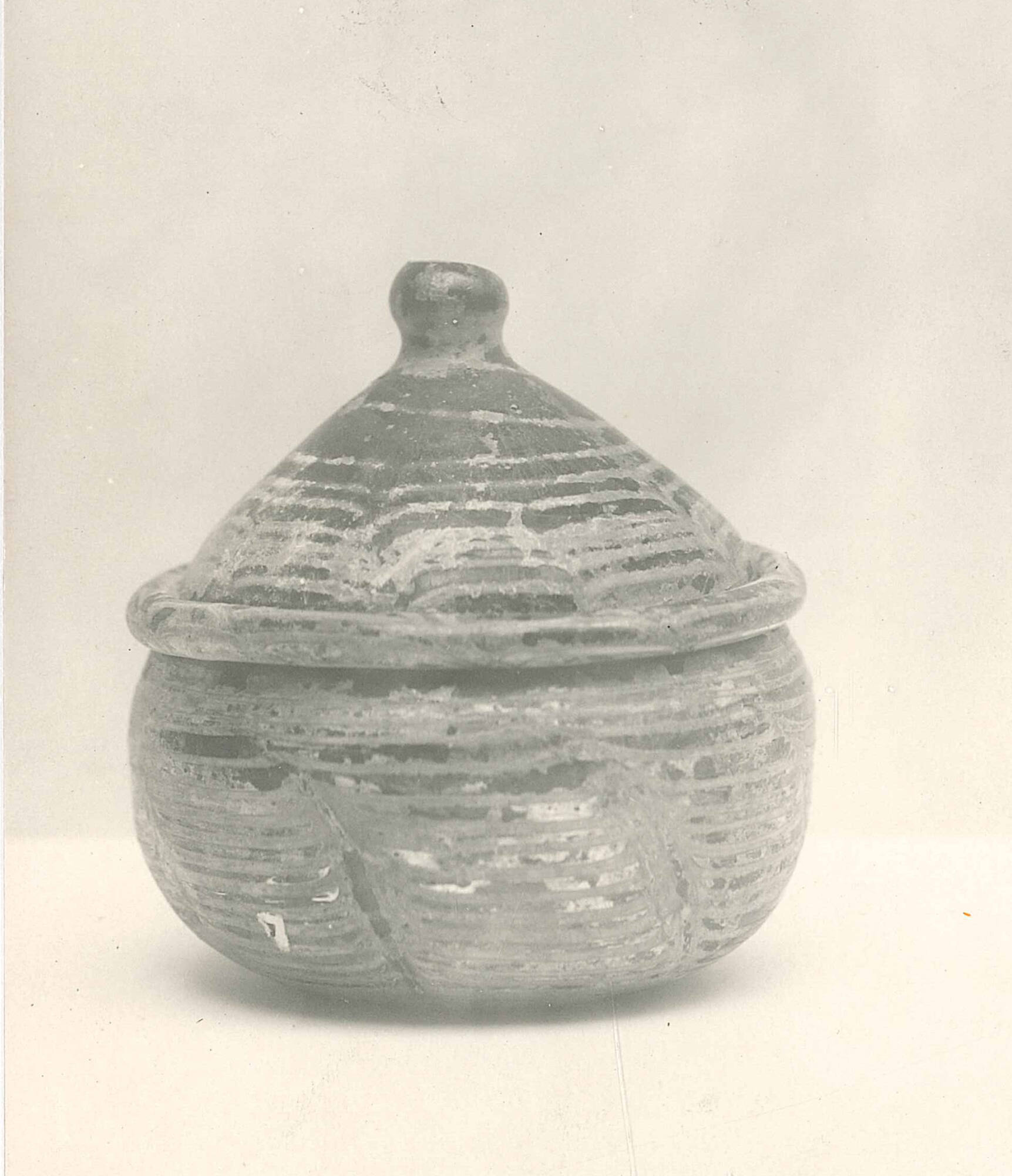 DescriptionGreen ground; applied white decoration. Bowl: hemispherical shape. Cover: spherical knob on top; conical shape; tooled ridge above juncture with body. Cover and bowl decorated with white trails in festoon pattern.