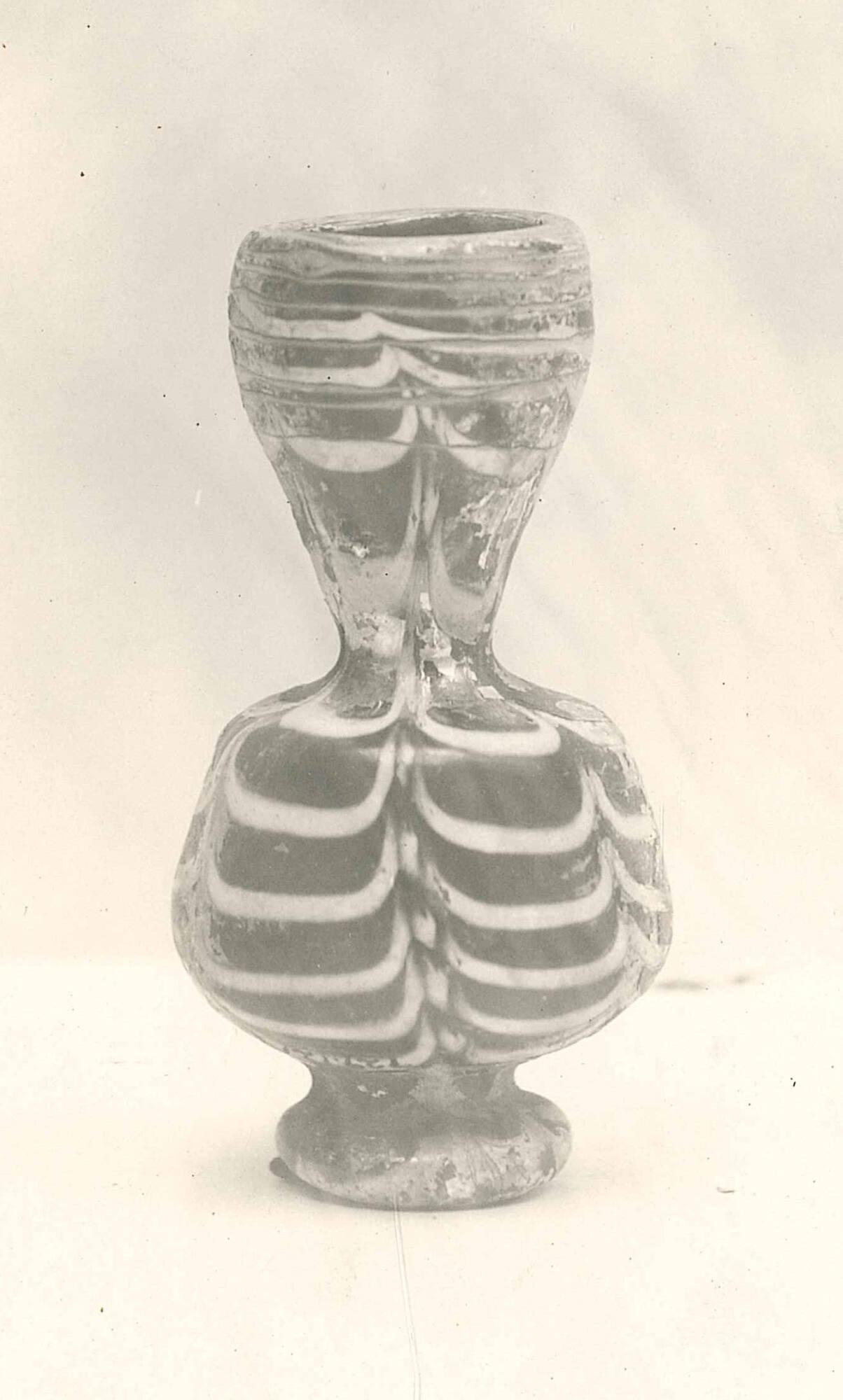 DescriptionPurple ground; applied white and green decoration; wide mouth; wide conical neck; upper half of neck with thin green spiral thread; body widens toward bottom, curves in sharply to foot; circular foot; decorated with opaque white trailed threads in festoon pattern; foot is uneven, making piece appear lopsided.