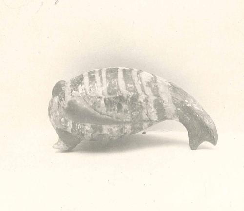 DescriptionPurple body; opaque white and opaque red decoration and features; ovoid body with applied white spiral thread; up-turned tail; applied red head with white eyes and beak; applied red wings and feet.