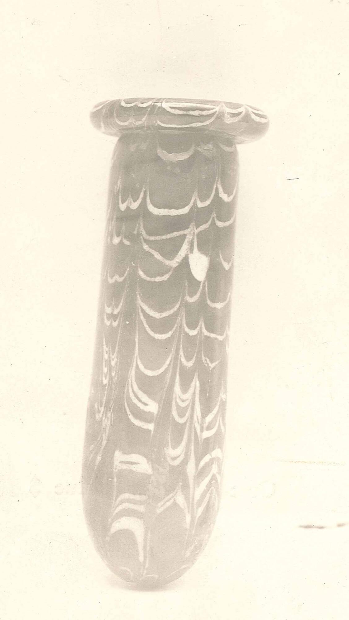 DescriptionOpaque dark amber ground (appears black); opaque white and opaque red decoration; horizontal rim; cylindrical body; rounded bottom; decorated with opaque white and opaque red threads in uneven festoon pattern; made in imitation of ancient core-formed glass.