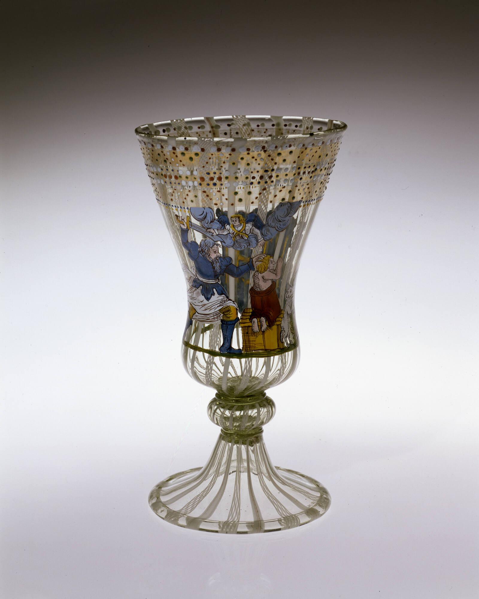 Label TextThe scene on this goblet depicts the Old Testament story in which God tests Abraham’s faith by asking him to sacrifice his son Isaac, as told in Genesis 22. The image probably derives from a contemporary woodcut illustration of the same subject. The reverse side of the goblet bears the monogram “HLX” in a blue shield.Published ReferencesPage, Jutta-Annette, The Art of Glass: Toledo Museum of Art, Toledo, Ohio, Toledo Museum of Art, 2006, p. 104, repr. (col.).1815-1840