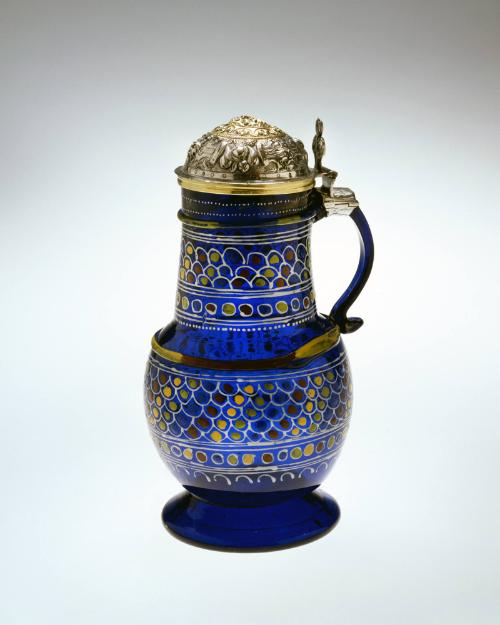 MediumTransparent blue glass; blown, applied, gilded, enameled; unmarked gilded silver cover