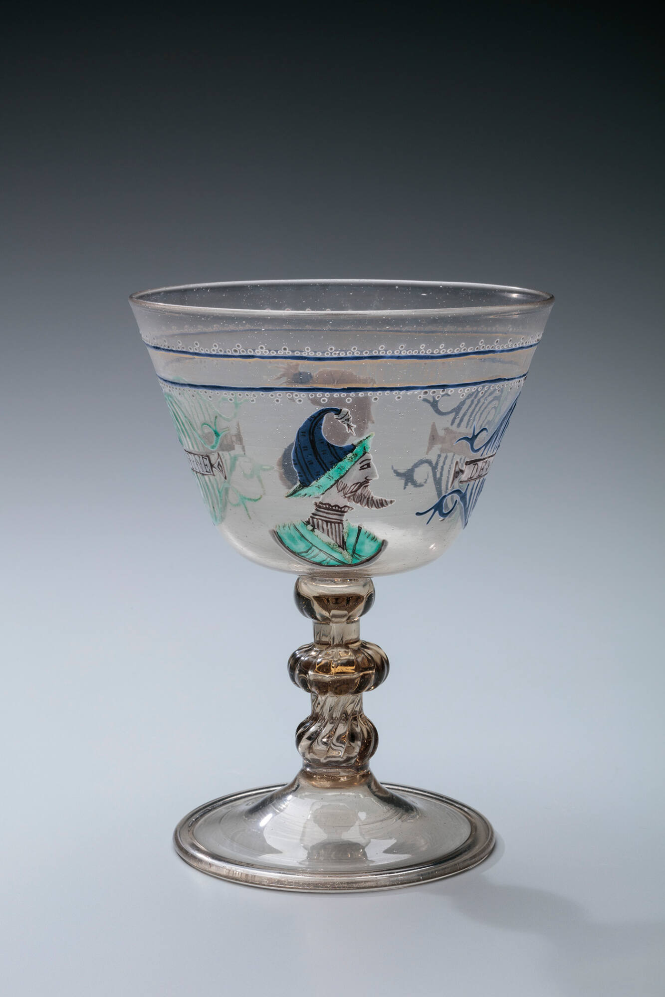Label TextProbably given as a gift for a wedding or betrothal, this goblet features the profile bust of a French soldier facing the profile of an idealized woman. The inscriptions between the figures bear the French words “DE BON LE” and “VOUS DONNE” (meaning “Given to you by a good heart”). Below the rim is a gilded band inscribed in Latin, DOMINE LABIA MEA APERIES ET OS MEUM ANNUNCIBIT (“Lord, open Thou my lips and my mouth shall announce [Thy praise]”).Published ReferencesPage, Jutta-Annette, The Art of Glass: Toledo Museum of Art, Toledo, Ohio, Toledo Museum of Art, 2006, repr. (col.) p. 87.Last quarter of the 17th century