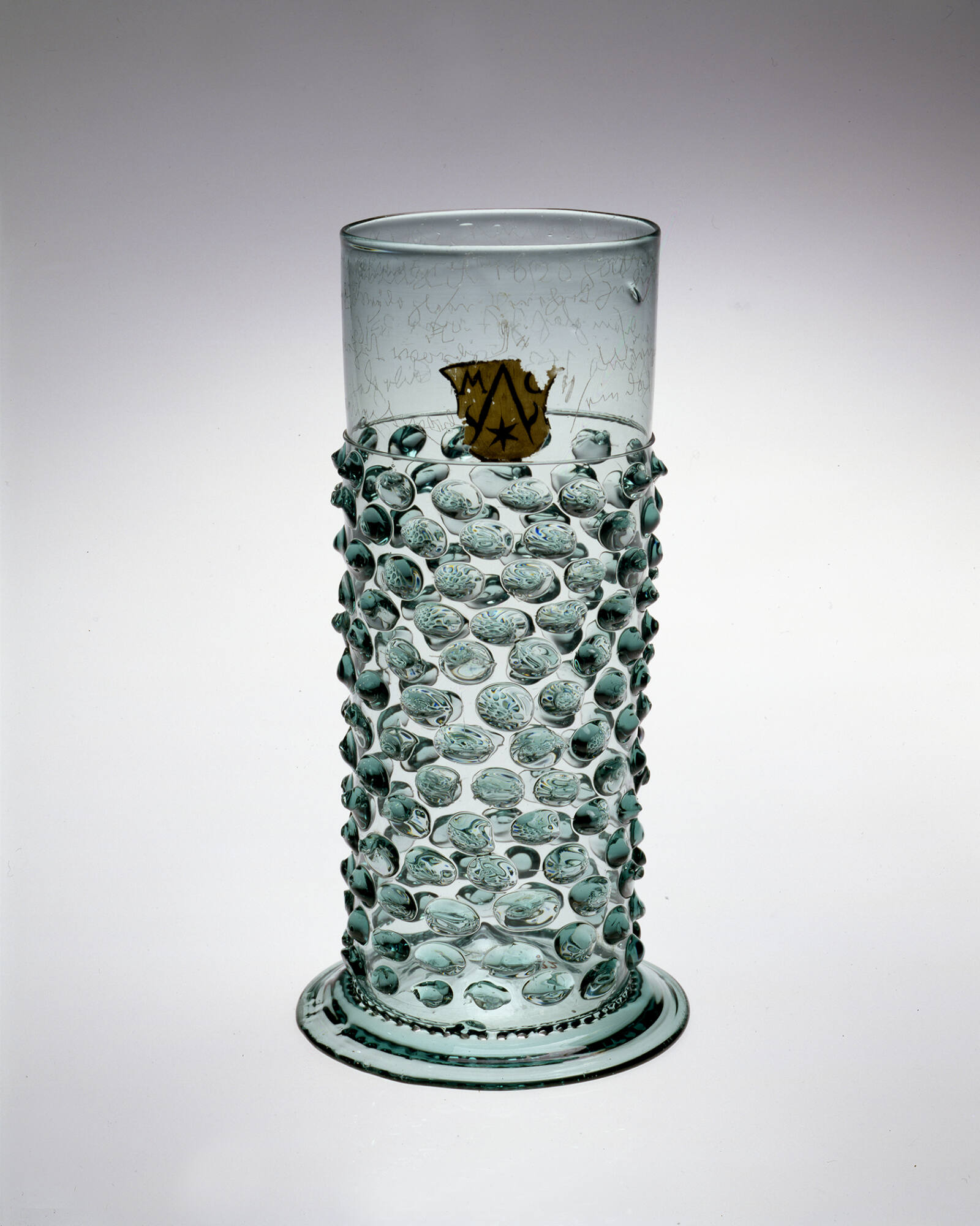 MediumTransparent green glass; blown, applied prunts, diamond-point engraved