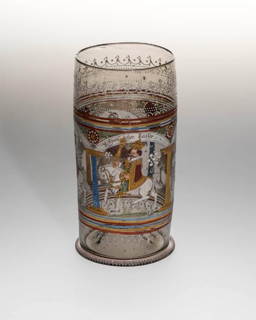DescriptionLight grayish glass; polychrome enamels, gilt; divided into four sections by architectural elements; one section depicts the Emperor; the other, three electors: "Mentz" (Maintz); "Collem" (Cologne); "Trier."