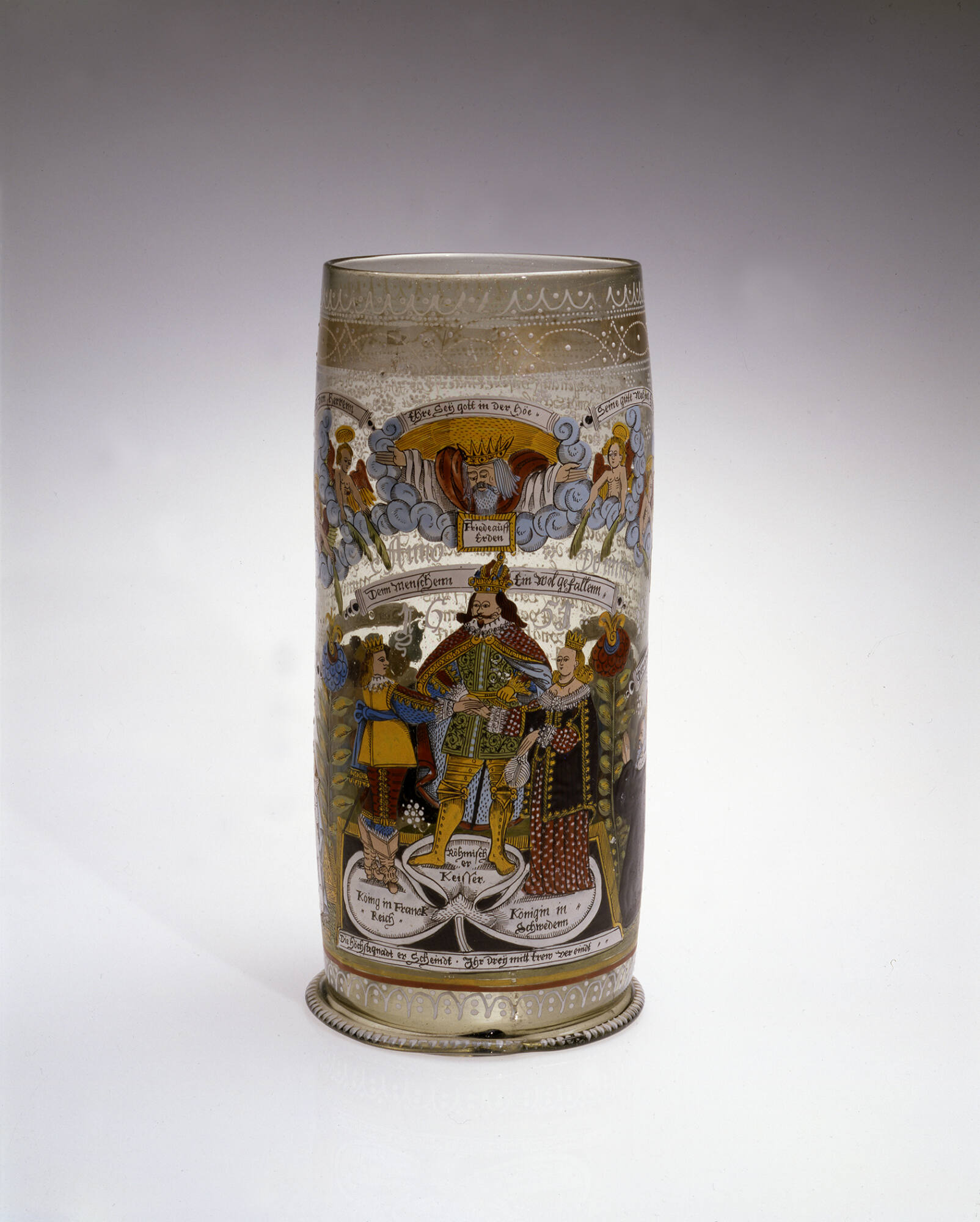 Label TextThis tankard (a form known as a Humpen) is decorated with an elaborate scene celebrating the Peace of Westphalia (1648), a series of treaties that ended the Thirty Years War involving most of the major powers in Europe. It features the Holy Roman Emperor Ferdinand III, King Louis XIV of France, and Queen Christina of Sweden.Published ReferencesPage, Jutta-Annette, The Art of Glass: Toledo Museum of Art, Toledo, Ohio, Toledo Museum of Art, 2006, repr. (col.) fig. 2, p. 10.about 1498-1514