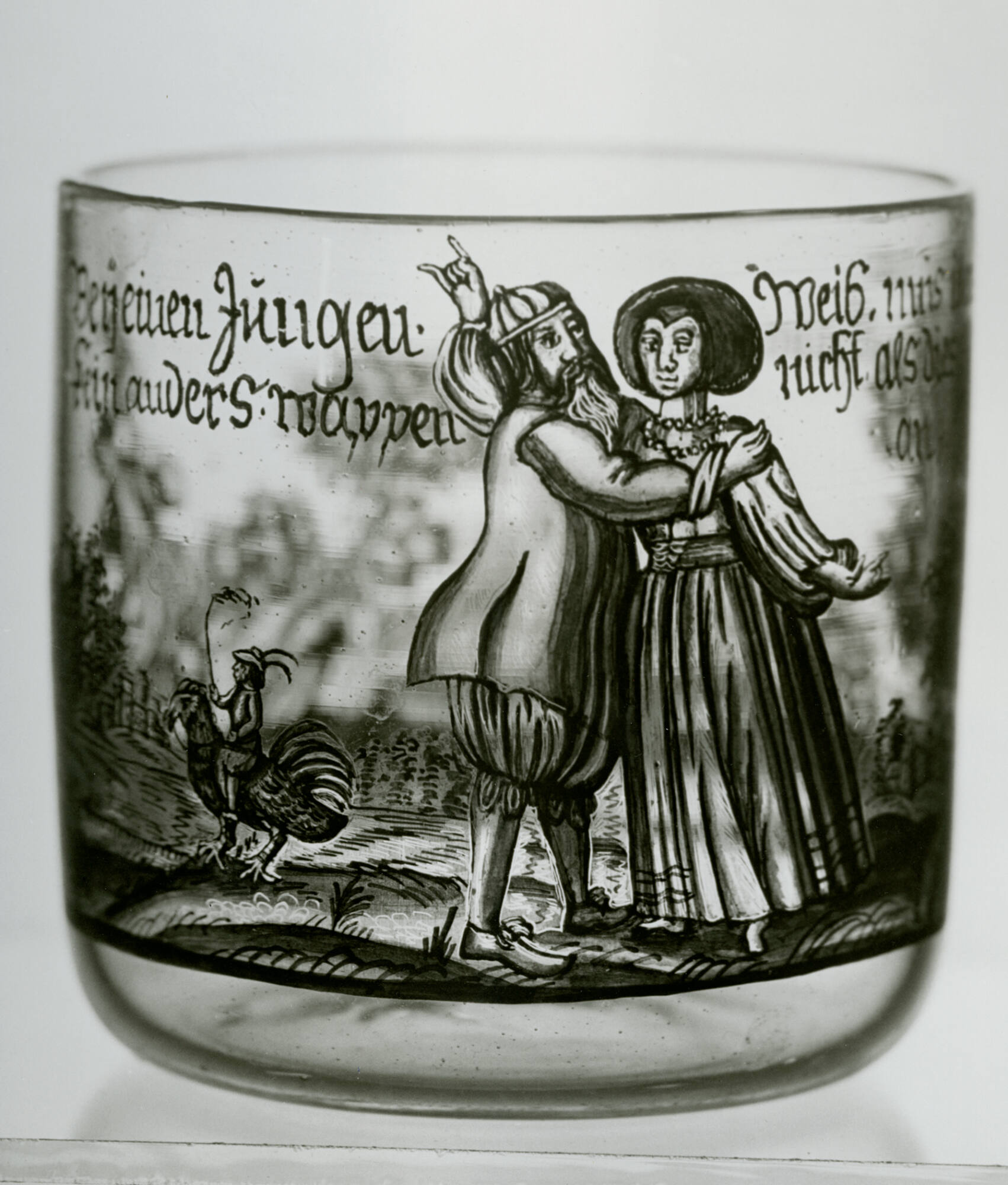 DescriptionColorless glass, black enamel. Landscape scene with large human figures.