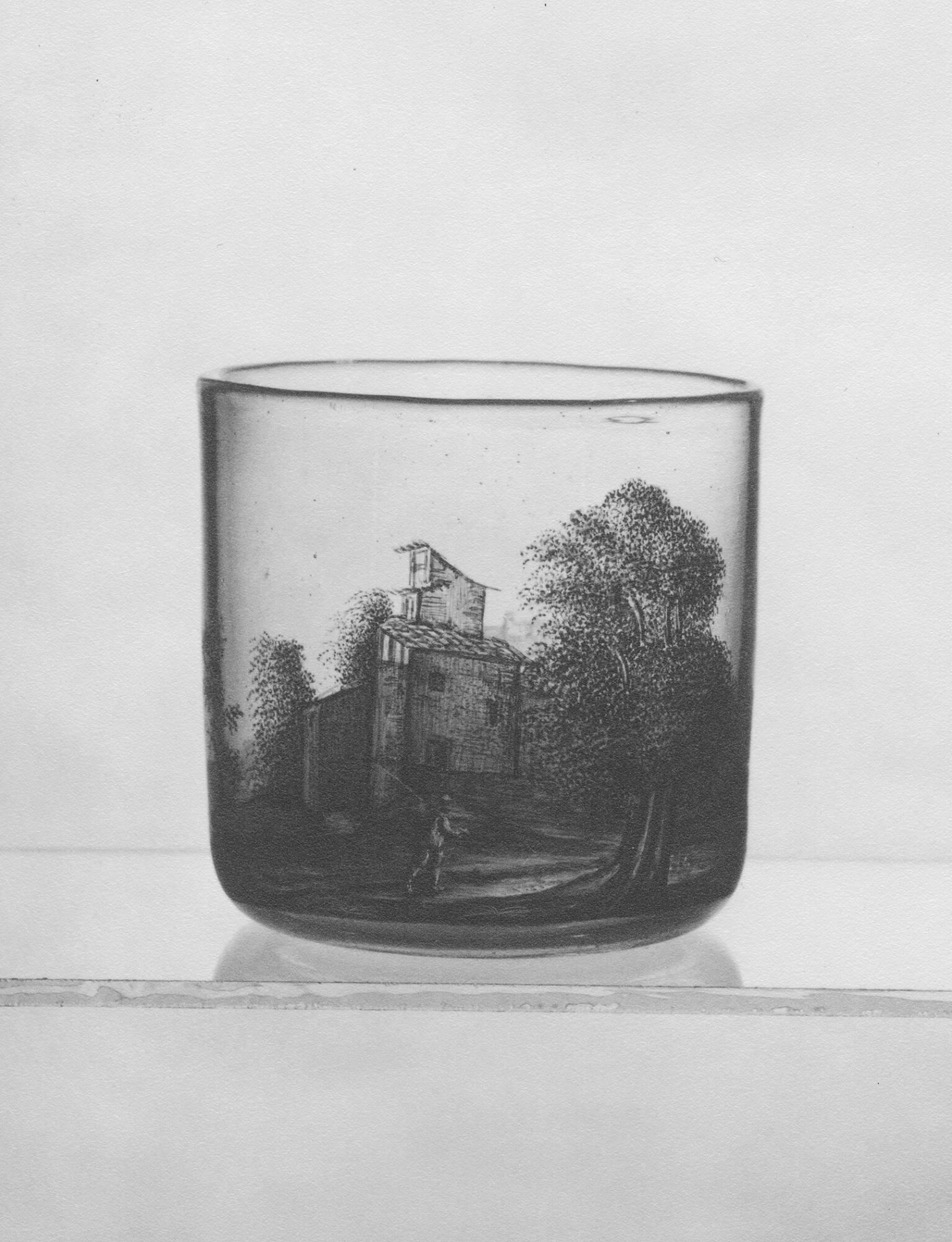DescriptionColorless glass, black enamel. Landscape scene with human figures