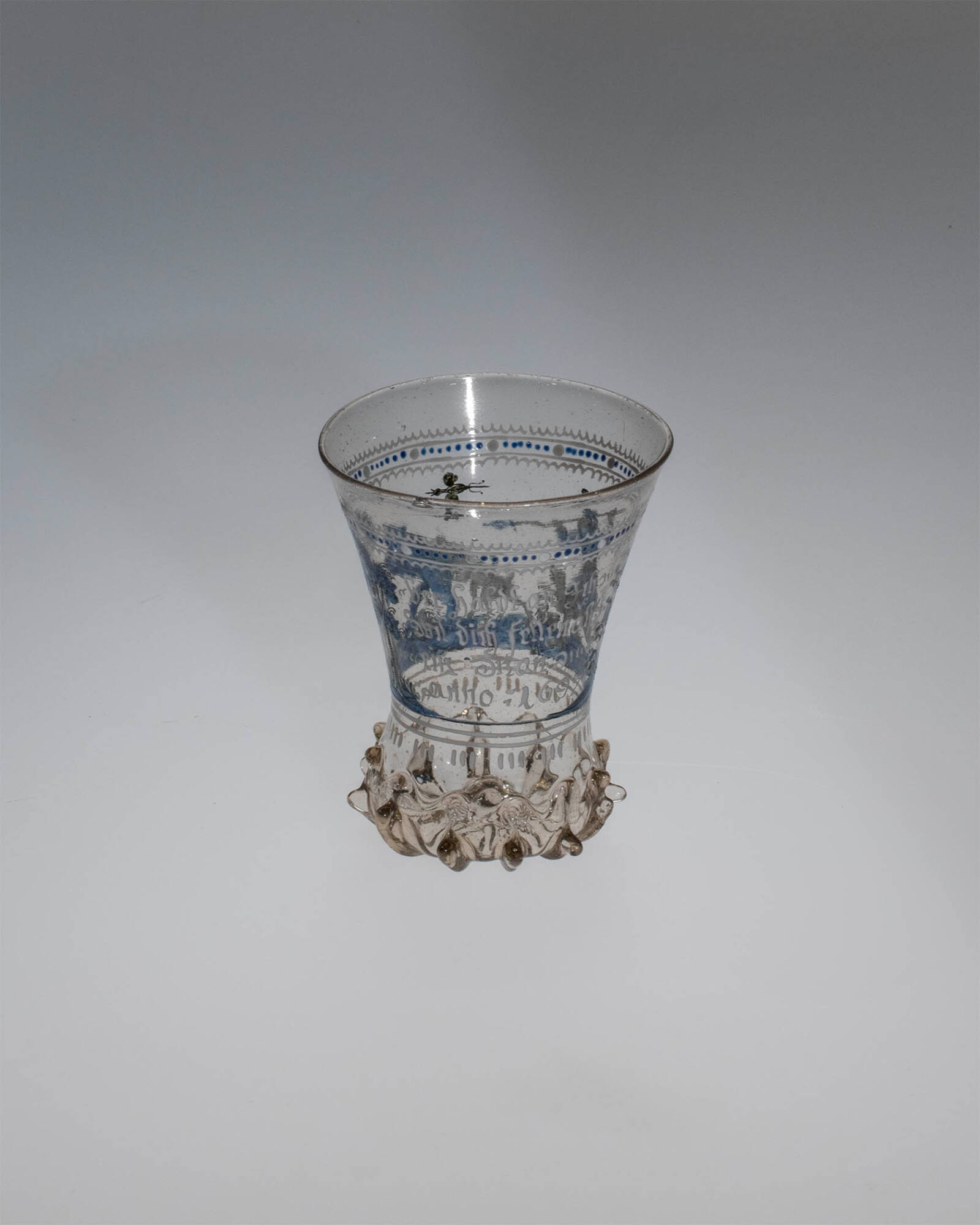 DescriptionColorless blown glass with yellowish tinge; blue, white, and black enamels; decoration of bear hunting scene; tooled spikes at bottom.
