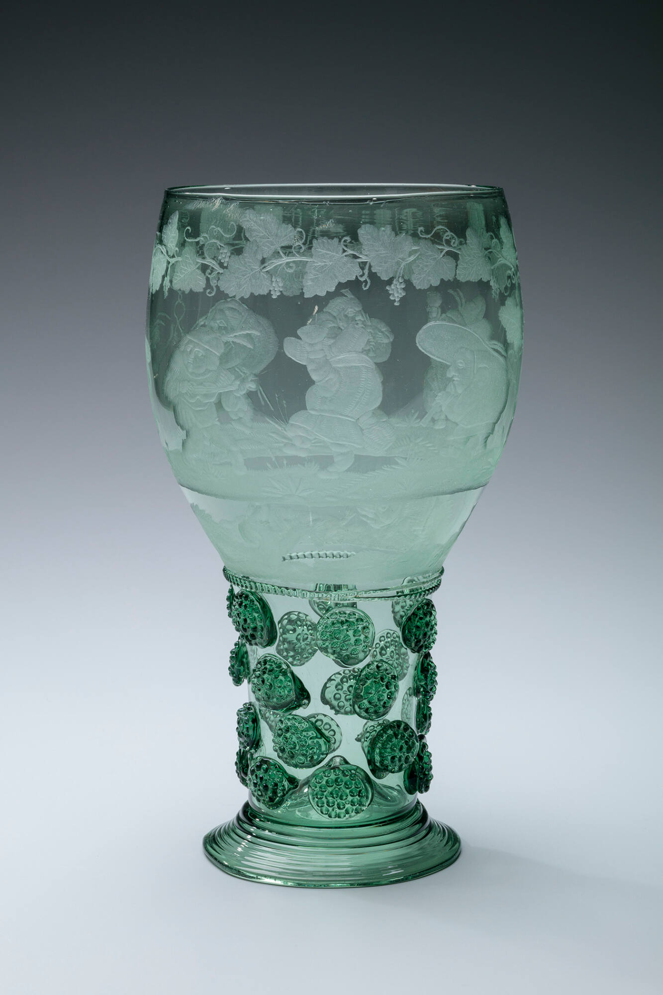 Label TextThe Dutch roemer (meaning “to praise” or “to toast”) is a type of wine glass that evolved in Germany and in the Netherlands over several centuries, reaching perfection in the 17th century. Usually colored in shades of green, roemers were popular in the Netherlands for drinking white wine. The stamped “raspberry” prunts on the base helped the drinker keep a firm grip on the glass in an era before the widespread use of forks, when hands tended to get greasy during a meal. The eight wheel-engraved, dwarf musicians on the bowl of this glass derive from engravings by the French artist Jacques Callot (1592–1635) from a 1616 series called “Various Hunchbacked Figures” (Figure Gobbi). These images enjoyed lasting popularity in Europe. The sea creatures in the register beneath the figures were taken from engravings by Nicolaes de Bruyn (1571–1656).Published ReferencesToledo Museum of Art, Toledo Museum of Art Masterworks, Toledo, 2009, p. 172, repr. (col.).Nicolas de Larmessin II