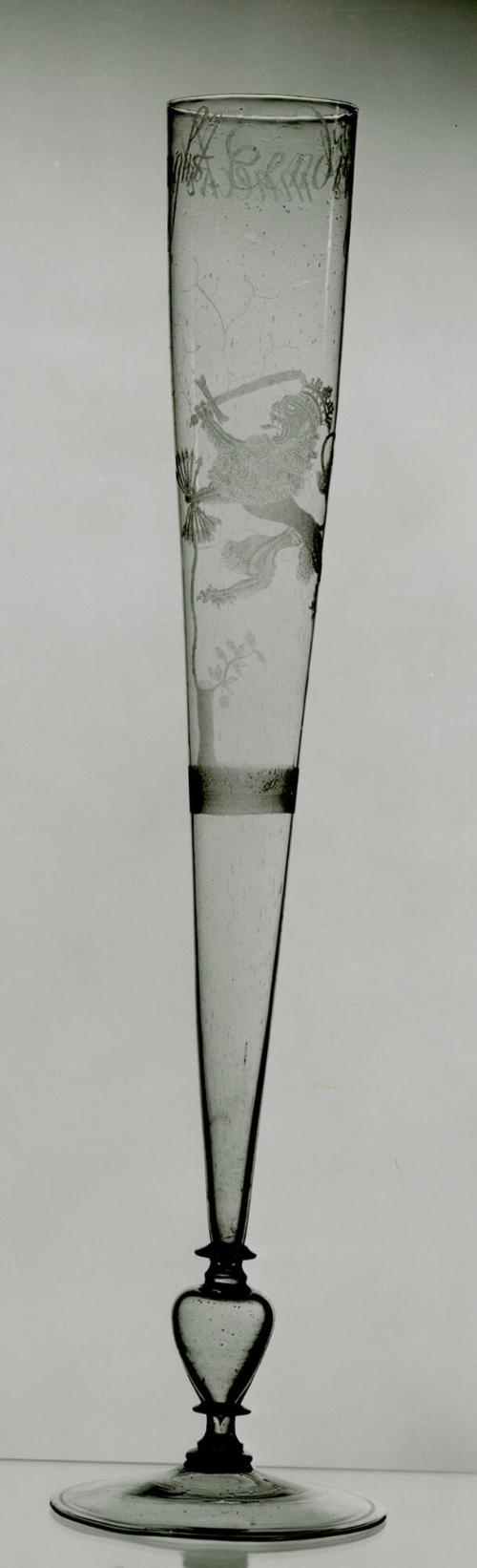 Label TextEggshell-thin glassware in the Venetian style (façon de Venise), made for the Dutch market, was sometimes decorated with engraved texts, images, and symbols to mark special occasions. This flute, inscribed “Strength in Unity” in Dutch, features the lion symbolic of the Dutch Republic and a stylized tree representing the ruling House of Orange.Published ReferencesToledo Museum of Art, Toledo Museum of Art Masterworks, Toledo, 2009, p. 182-83, repr. (col.).Late 17th century