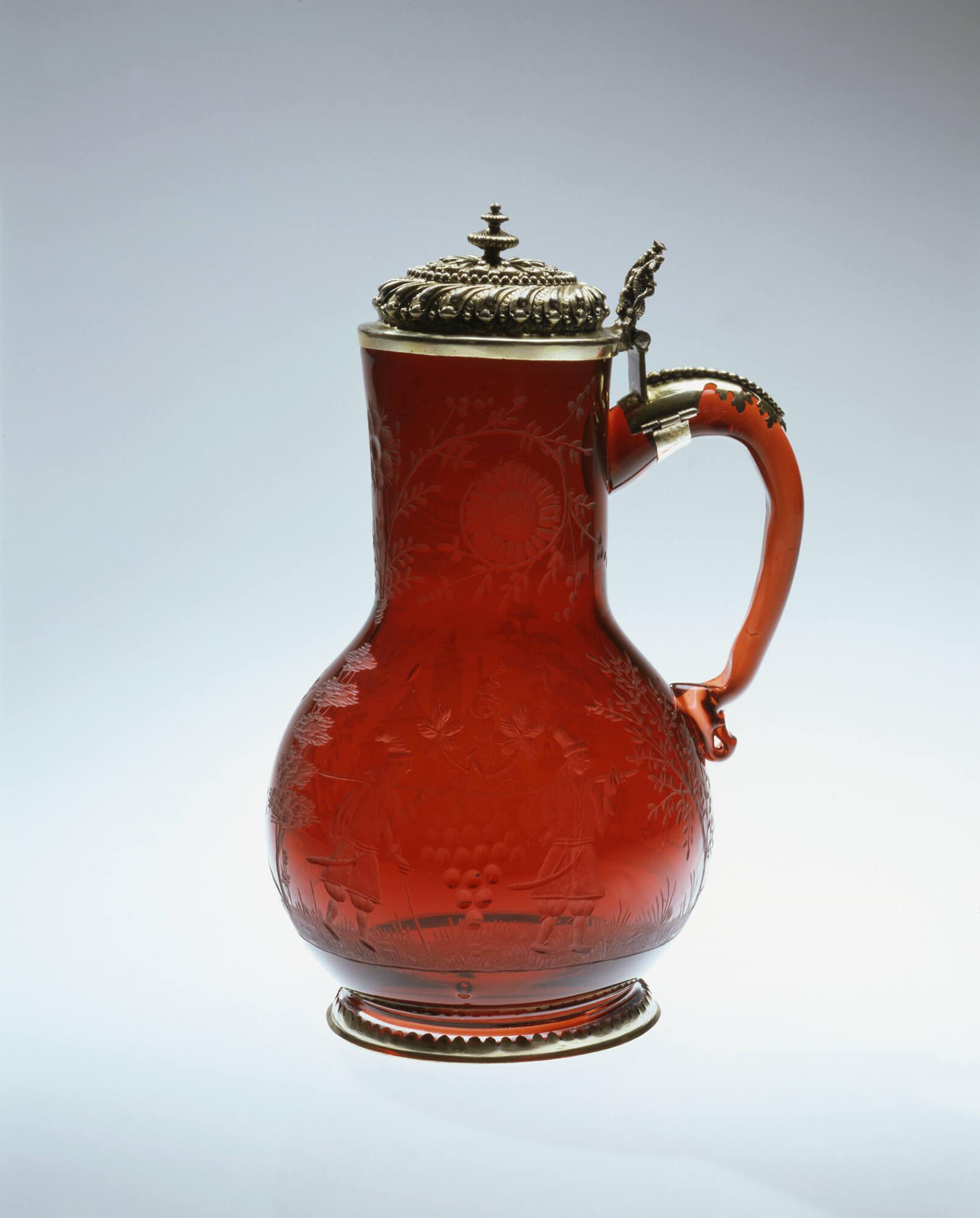 DescriptionTransparent gold ruby glass; blown, applied, copper-wheel engraved; cover and foot gilded and chased silver