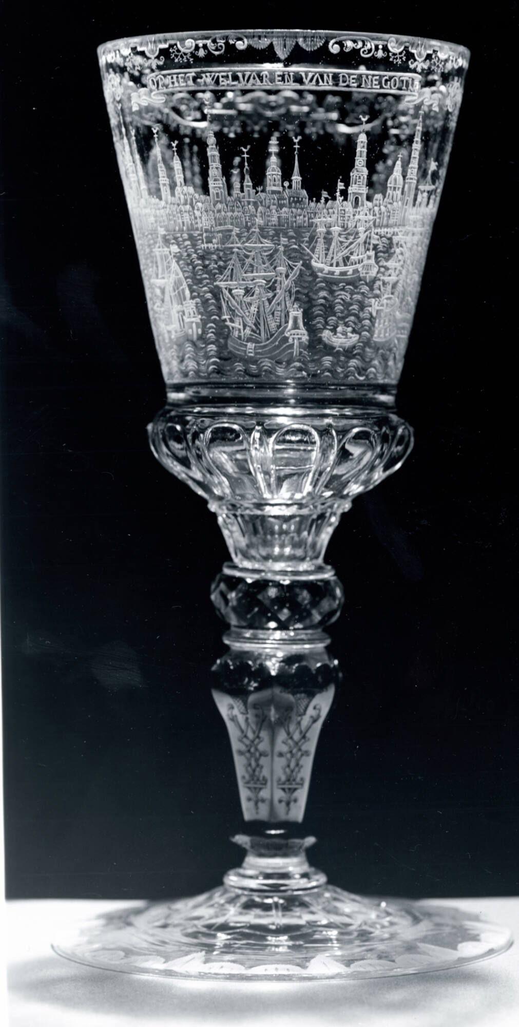MediumBlown and cut glass, with wheel-engraved decoration and silver-mounted stem