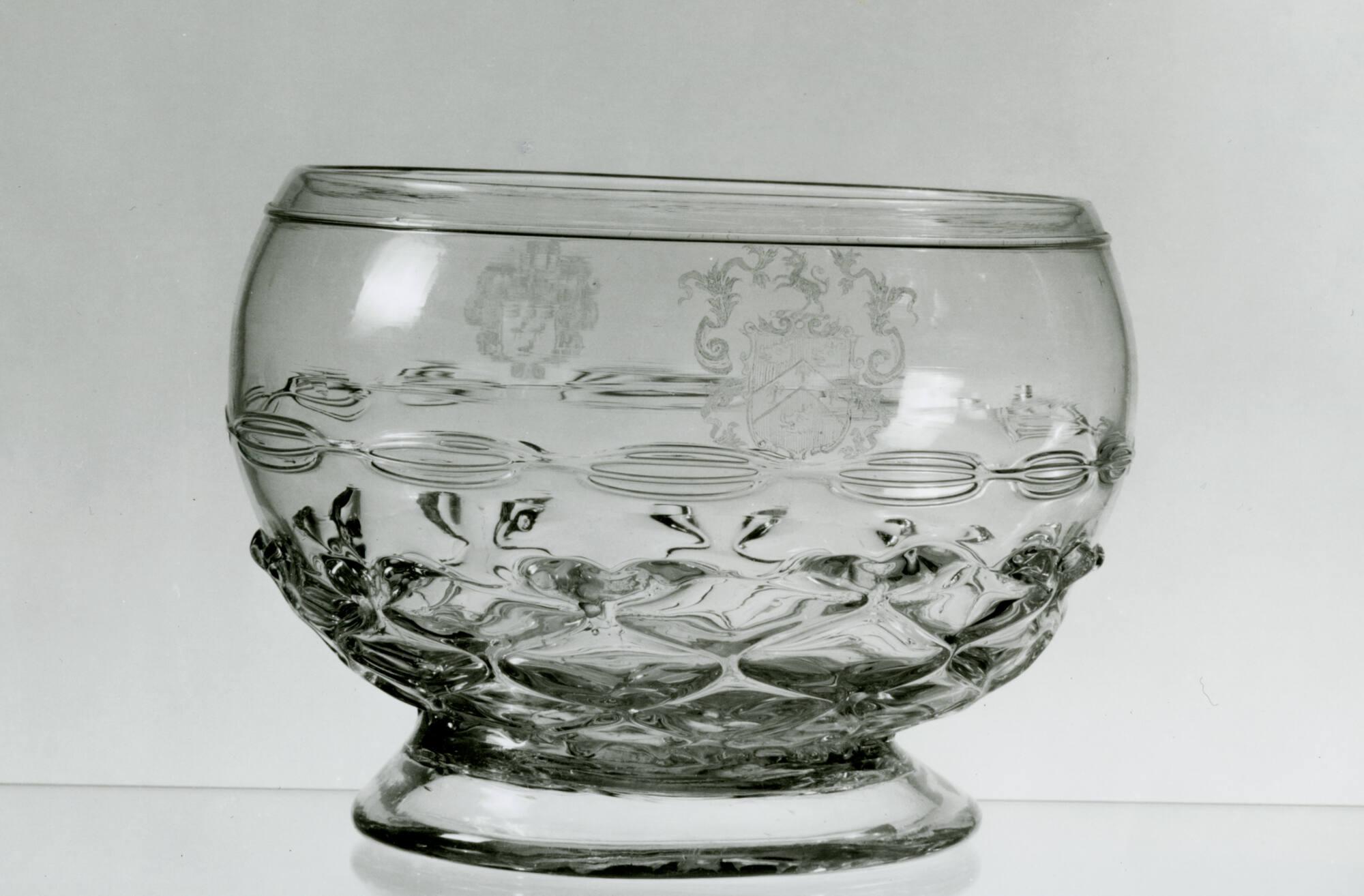 DescriptionClear glass, Ravenscroft type; cupped-in globular shape on base. "Nipt-diamond-waies" and applied chain around body. Engraved with coats-of-arms of the Arundel and Thelwall families.